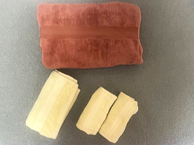 SET OF TOWELS - 1 Large Brown (25inx50in), 1 Middle Yellow (24x12). 2 Small (112z12)