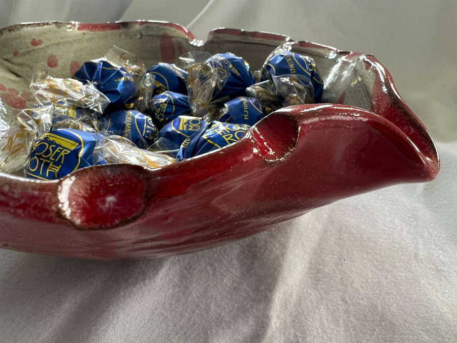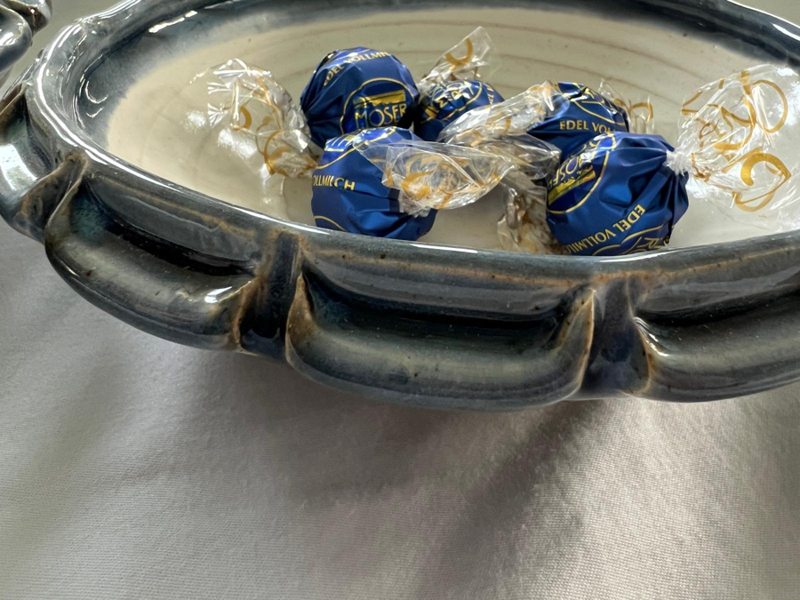 Set of two pottery bowls each approximately 8” dia. X 2.5” high blue outside with a white interior with fluted edge. Prefect for candy or serving food.