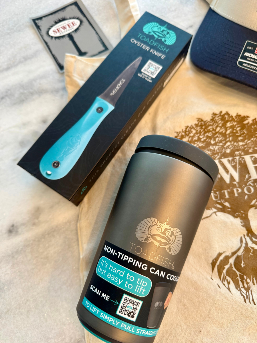 Bid on this Sewee Outpost package featuring a Toadfish Oyster Shucker, a Toadfish Non-Tipping Tall Can Cooler—perfect for a day on the water—a stylish Sewee Outpost hat, and more. Whether you’re shucking fresh oysters, keeping your drink cold, or heading out for a boat day, this bundle has everything you need to enjoy the Lowcountry lifestyle.