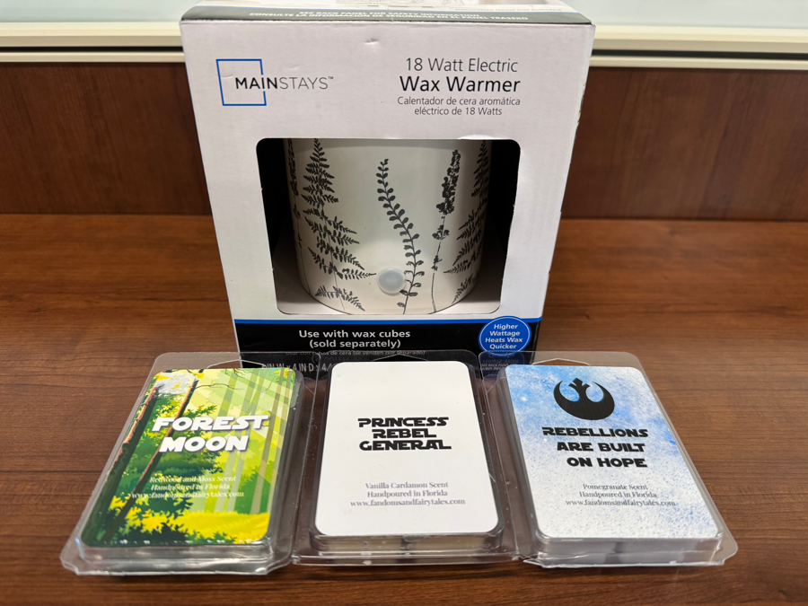 Wax Set: (1) Burdened with Glorious Purpose Trickster Scented (Loki) (2) Lydia (Beetlejuice), (3) Ecto Cooler Scented (Ghostbusters) and Wax Warmer Wax melts are hand poured by Etsy seller https://fandomsandfairytales.com/ Fandoms and Fairytales products are made with the highest quality ingredients available, including clean soy and parrifin wax for cleanest/safest scent release possible. Fragrance oils are free from phthlates and ingredients on the CA Prop 65 list. Solicited by: April Leake, NWFSC