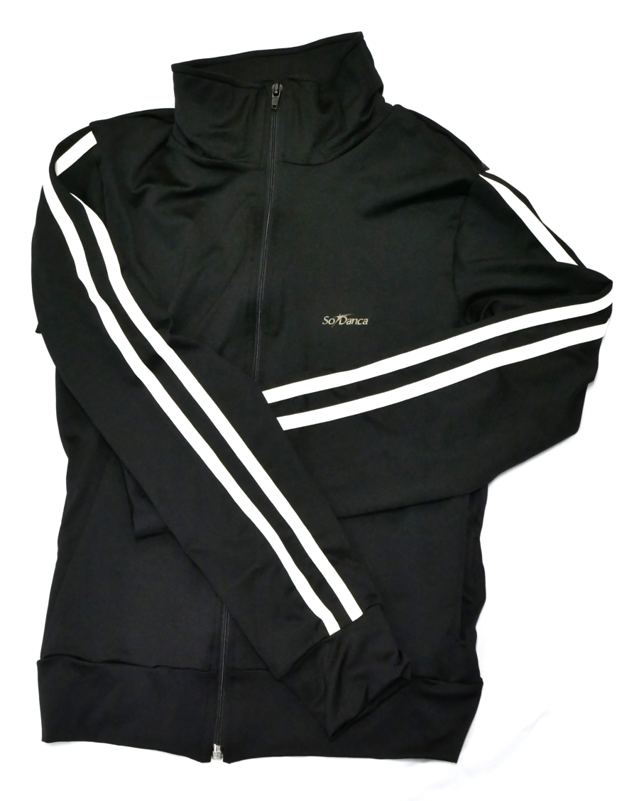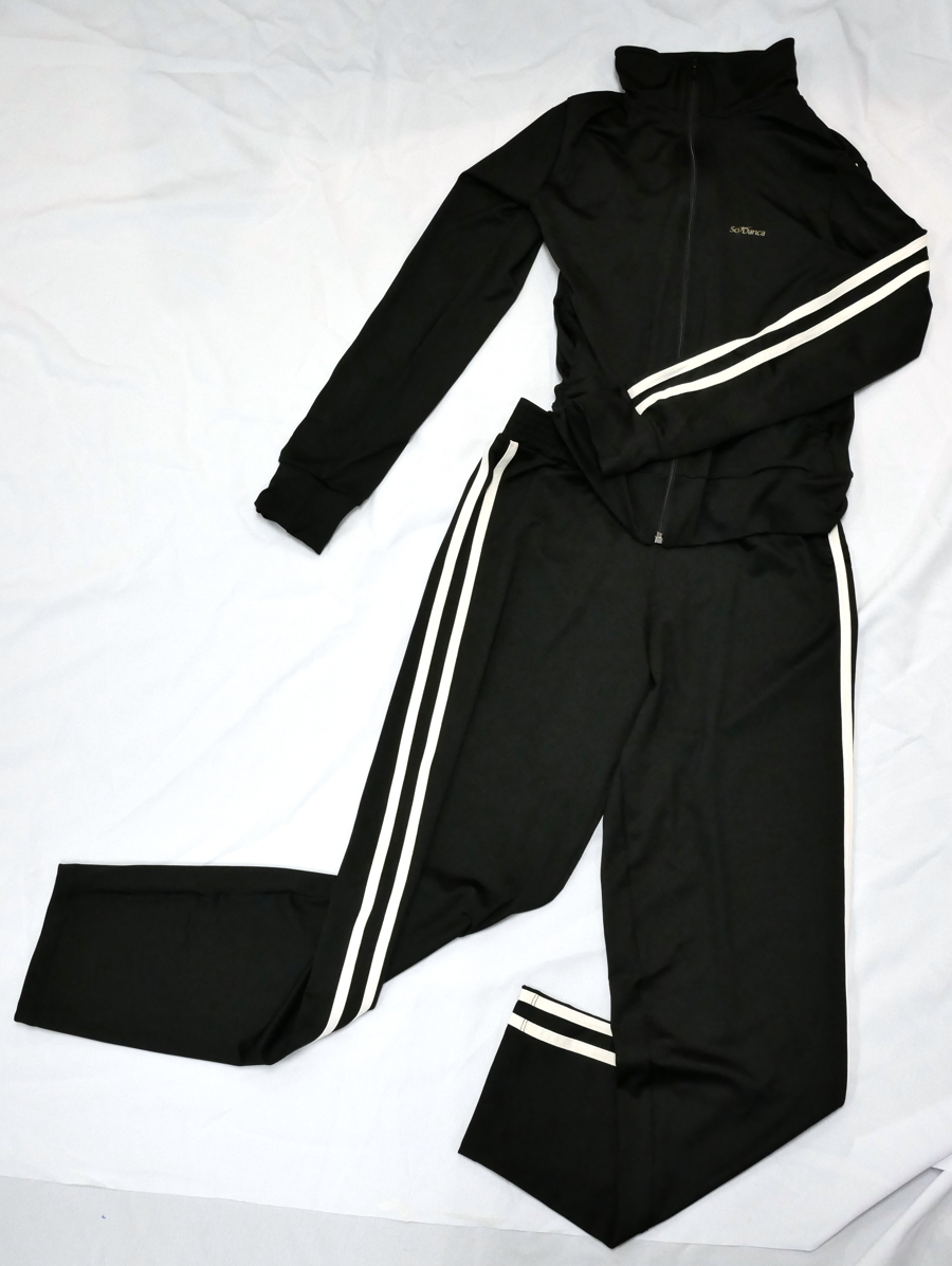 Introducing the Shari Rarick School of Dance Workout Gear, perfect for dancers who want to look stylish while staying comfortable. This set includes a black jacket and pants featuring a chic white stripe, along with a classic black and white leotard. Designed in a size small, this workout gear is ideal for dance classes, practice sessions, or even casual outings.
