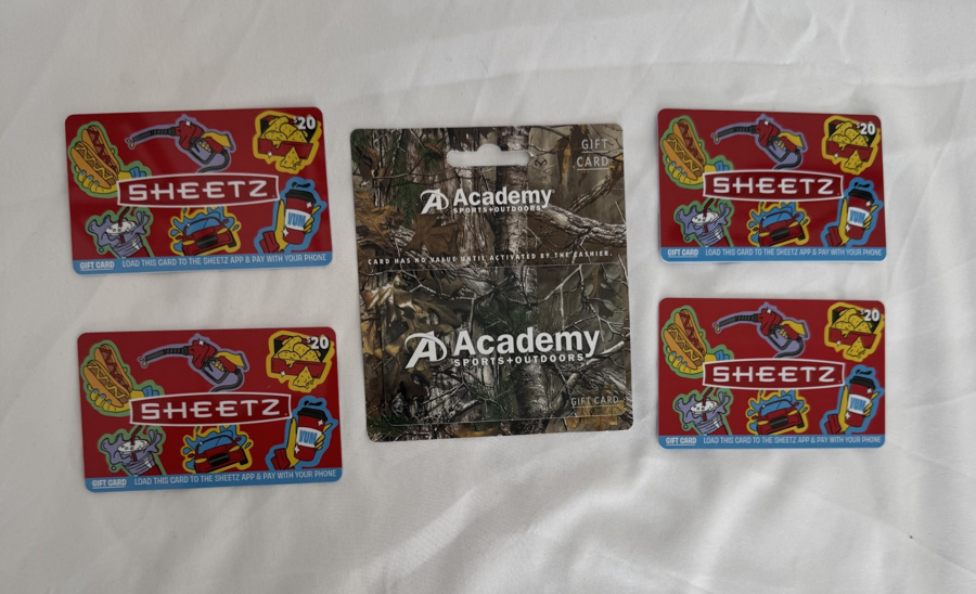 Up for auction is a fantastic opportunity to grab four $20 Sheetz gift cards and one $25 Academy Sports gift card! Whether you're looking to fuel up on your favorite snacks and drinks at Sheetz or gear up for your next outdoor adventure with Academy Sports, this bundle has you covered. Don't miss out on the chance to enjoy these versatile gift cards, perfect for anyone who loves convenience and sports. Bid now and take home these great gift cards!