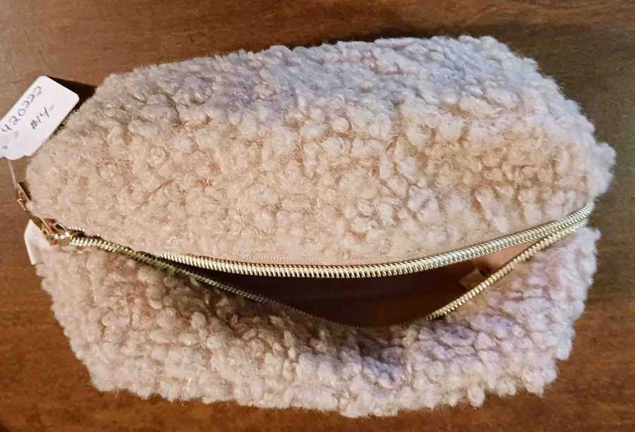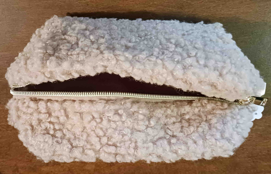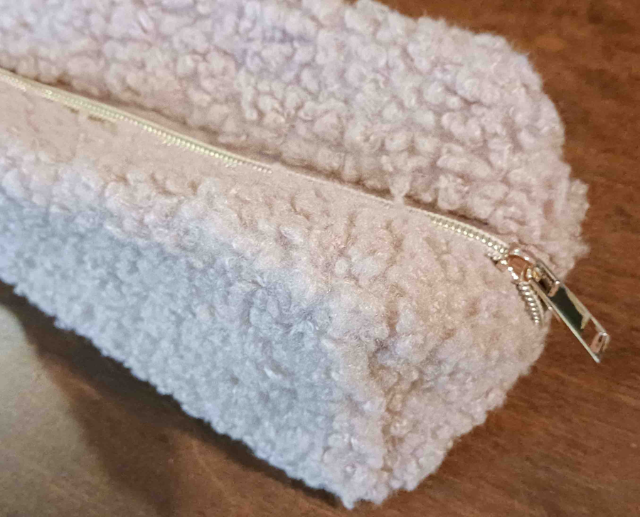 This soft beige, zippered bag is the perfect place to stash your makeup, your favourite pens and pencils, etc. Measures 7"x4.5"x3.5"