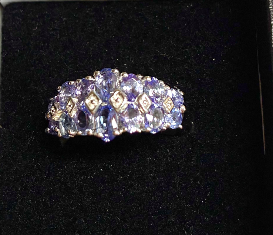 Shimmering Faceted Tanzanite Ring. Size 7 in rhodium-coated sterling silver. Phone camera can't capture the beauty of this ring. Tanzanite – Strengthens intuition and prophetic dreams. – Helps align your energy with your desires. – Shields against negative energies.