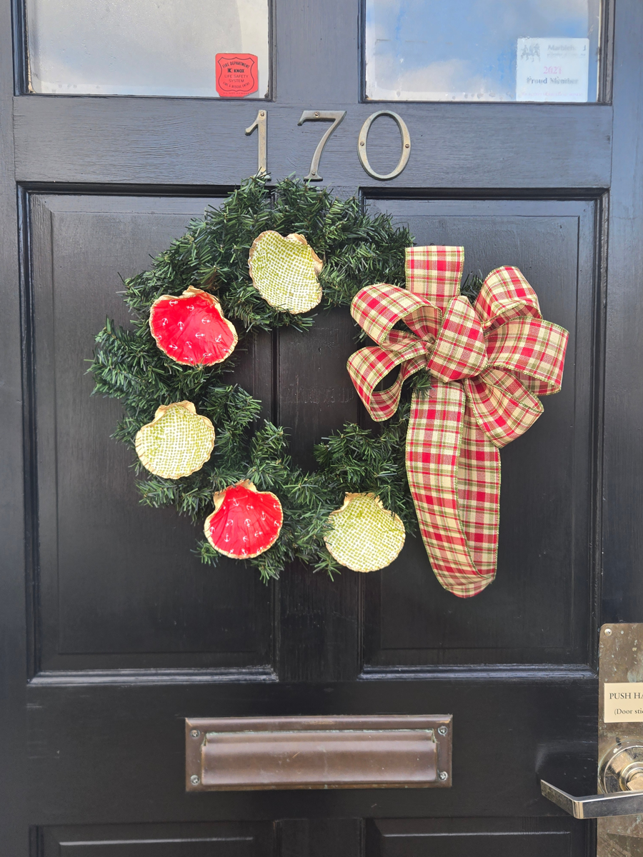 This wreath features scallop shells painted in a nautical design and a festive Christmas bow. It is suitable for indoor or outdoor use. Donated by Kim Downing