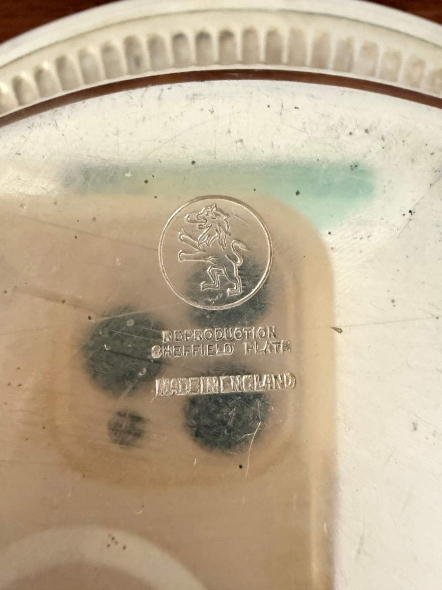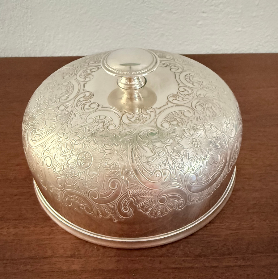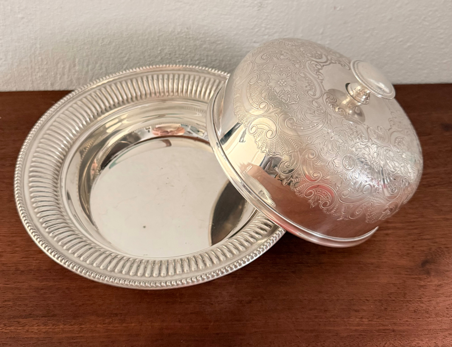 This is a vintage silver-plated covered serving dish or butter dish. It features ornate detailing and a decorative, lift-off lid. The piece is a "Sheffield Reproduction" design made in England. The dish can still be used for serving cold foods or keeping hot foods warm. However, use your thrifting imagination to repurpose it in your home or Airbnb to define elegance for the next generations.