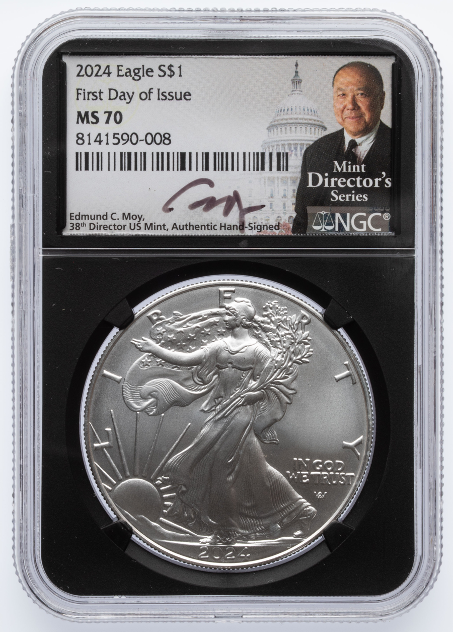This lustrous 2024 Silver Eagle dollar is signed by Edmund C. Moy, 38th Director of the US Mint, and graded MS70. * Following the auction, winners will receive an invoice for their winning bid and shipping costs.