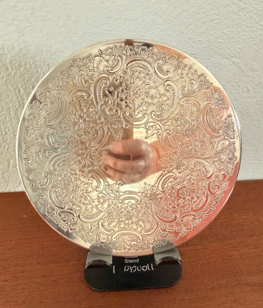 This is a vintage silver-plated serving trivets with an ornate engraved design. The elaborate scroll and floral pattern is common for this style of vintage tableware. It was used as a hot plate or serving mat to protect table surfaces and it can continue its life as such. The bottom is a soft rubber surface. Think of how lovely a candle would look on it, or uplace it under a plant to protect your furniture.