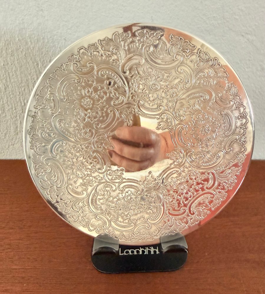 This is a vintage silver-plated serving trivets with an ornate engraved design. The elaborate scroll and floral pattern is common for this style of vintage tableware. It was used as a hot plate or serving mat to protect table surfaces and it can continue its life as such. The bottom is a soft rubber surface. Think of how lovely a candle would look on it, or uplace it under a plant to protect your furniture.