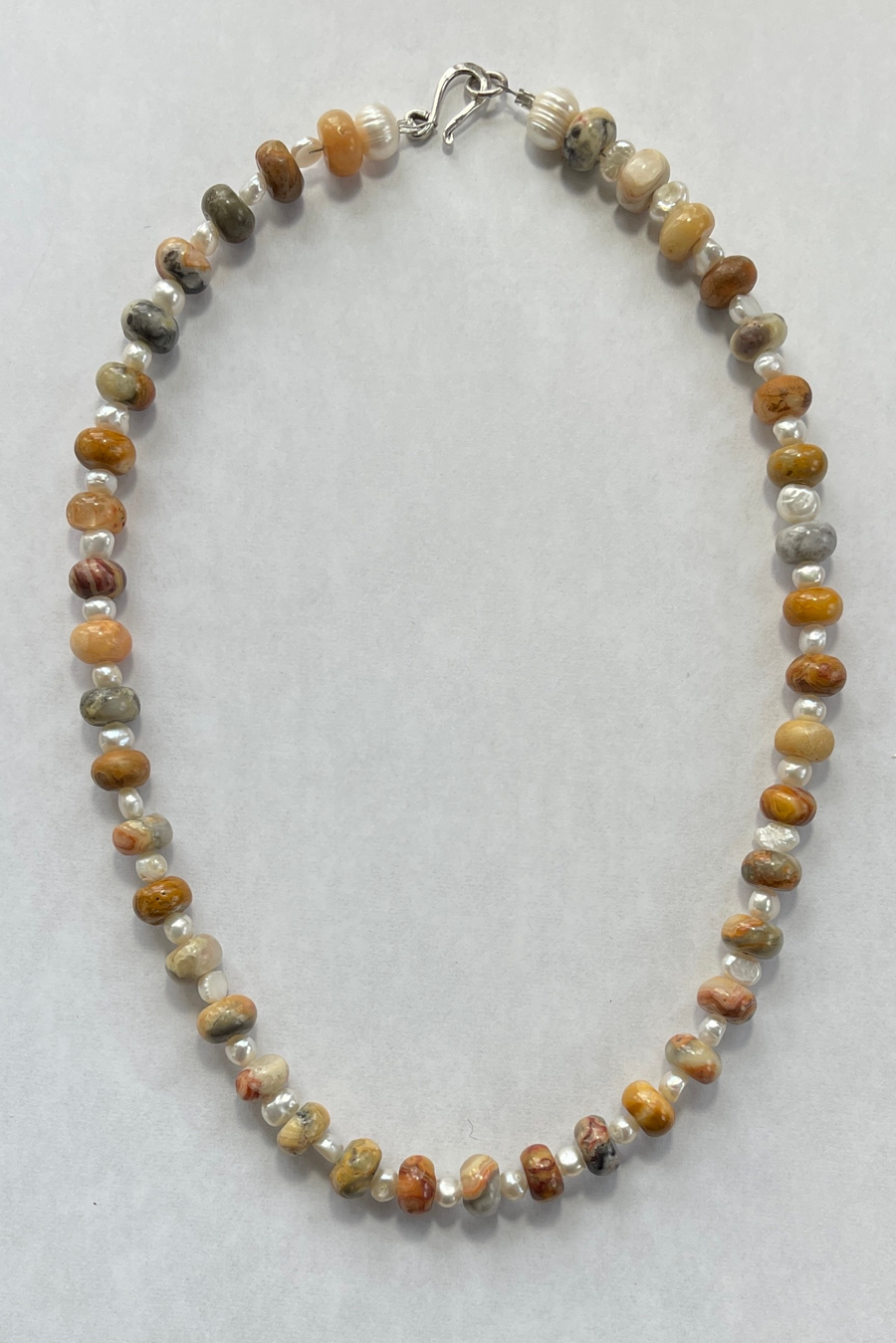 Artisan-crafted simple little necklace for those who like understated beauty. It's made of faceted Crazy Lace agate rondelles that are separated by tiny cultured pearls. A clasp of Thai silver finishes off the piece. Would make a great gift for that special young lady. Approx. 17" total.