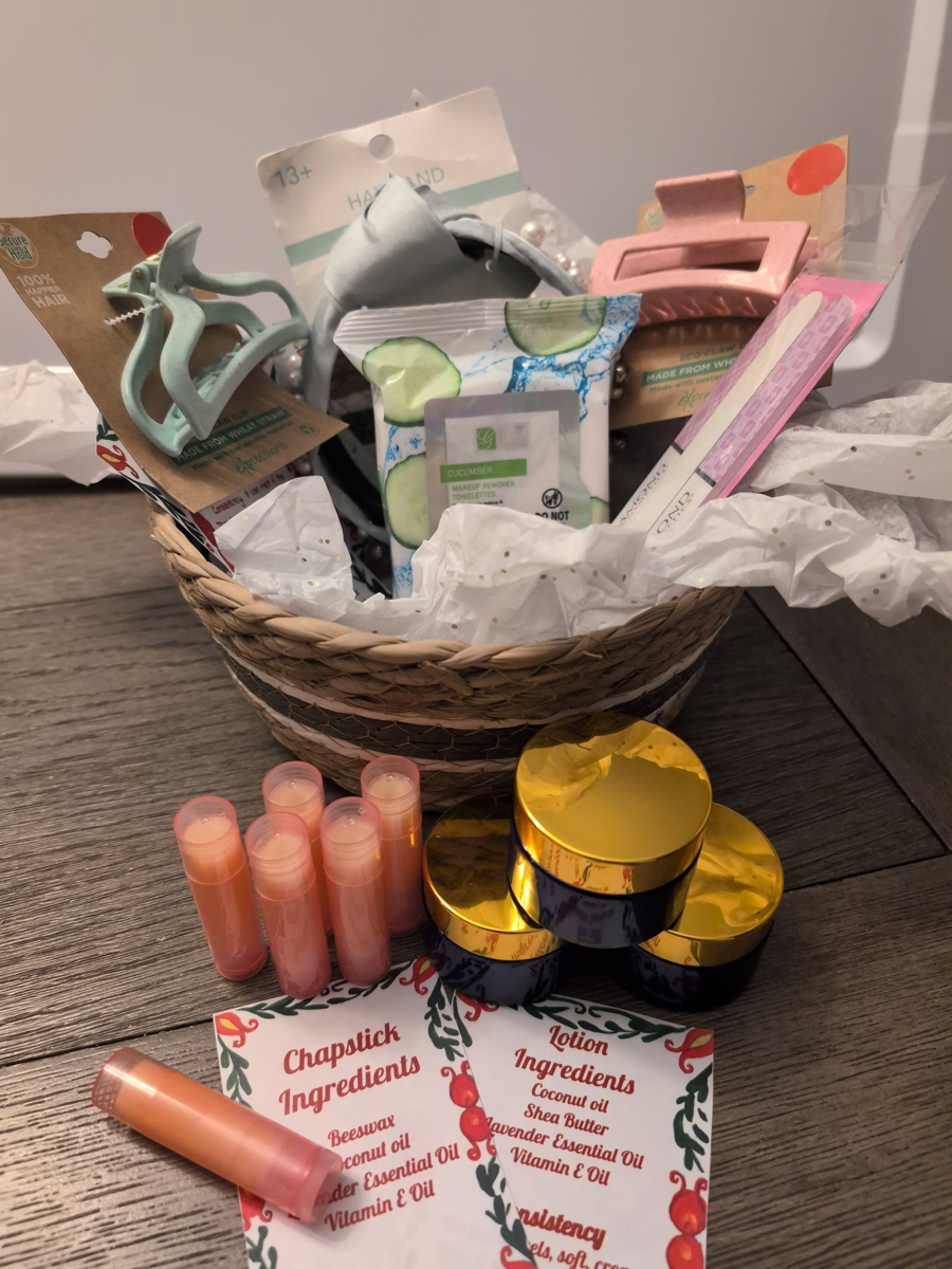(6) Homemade chapsticks, (3) homemade lotions, (2) hair clips, (1) headband, make-up remover wipes, nail files, & basket