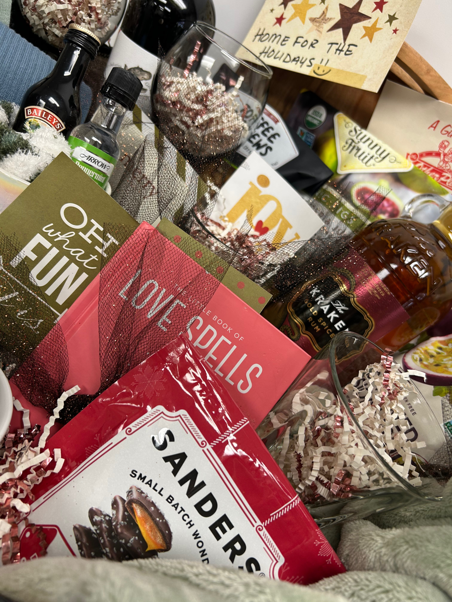 Indulge in an evening of cozy comfort and delicious treats with this curated gift package. “Sips and Snuggles” includes everything you need to relax, unwind, and enjoy a little luxury at home: • Drinks: Merlot wine, Kraken Gold Spiced Rum, travel-size RumChata, Baileys, peppermint schnapps (2) • Snacks & Treats: Toffee cashews (11 oz), dried passion fruit (3.5 oz), organic figs (7 packs), Sanders dark chocolate sea salt caramels (6 oz), Silly Cow Hot Chocolate • Cozy Comforts: Lucky Brand throw blanket, cozy low-cut socks (2 pairs), Goodfellow dress socks (2 pairs), “Slightly Obsessed” mugs (2), whiskey glasses (2), wine glasses (2) • Extras: Wooden tray, Little Book of Love Spells, $25 OP gift card, Brightroom stackable metal shelf Perfect for a night in, a romantic evening, or gifting to someone who deserves a little pampering.
