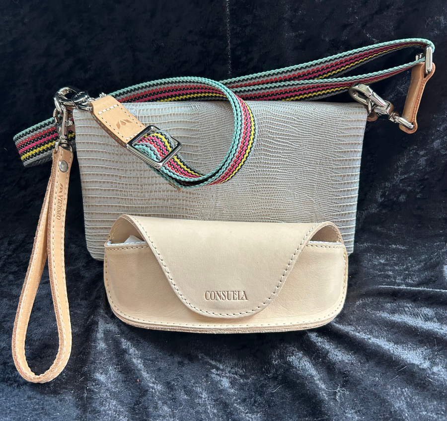 Step out in effortless style with this chic and functional bundle! Featuring a beautiful Consuela Uptown Crossbody Celeste Bag, perfectly paired with a sleek leather Consuela sunglass case, this set keeps your essentials organized while elevating any outfit.