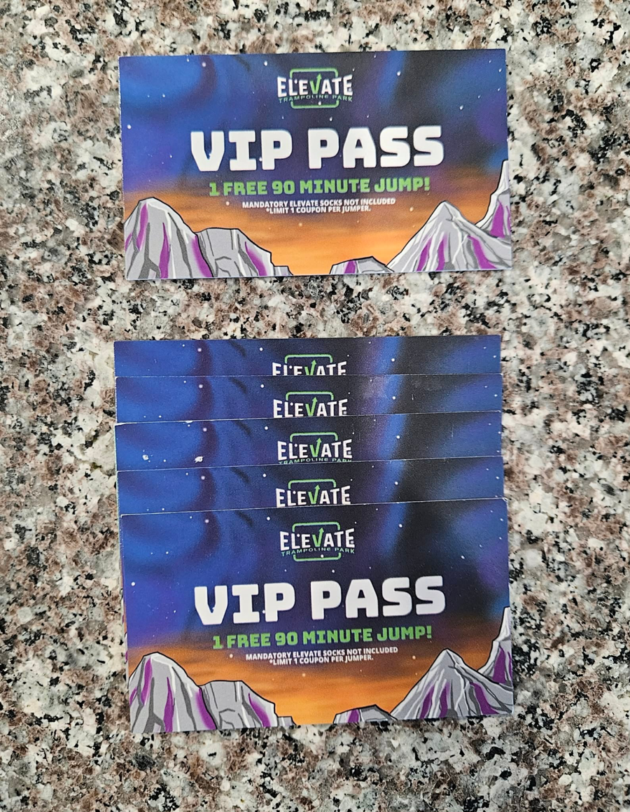 Six (6) VIP Passes to Elevate Trampoline Park at the South Tucson location. Each pass is valid for 1 FREE 90-minute jump session. (Elevate socks not included)