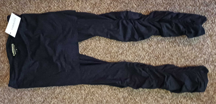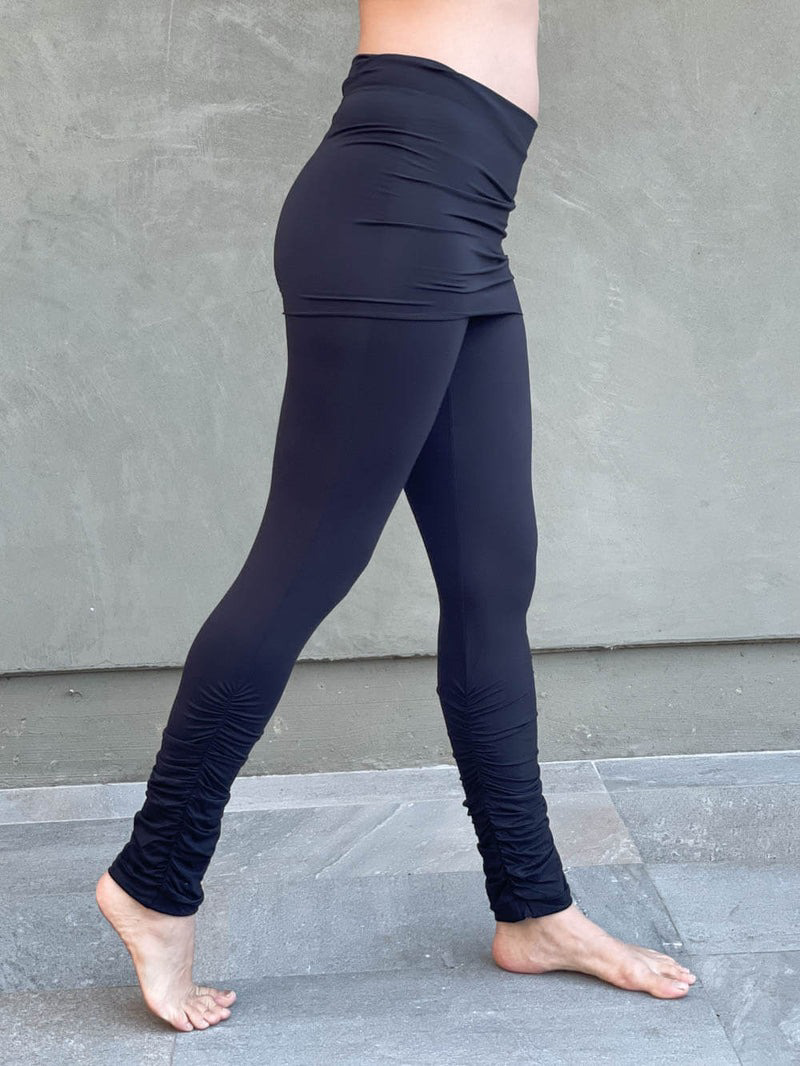 Ruched black leggings with skirt. Convertible, ankle-length leggings have ruched bottoms and can be folded up to become capris. The slim fold-over waistband doubles as a skirt and can be cut to any length desired. Made from a stretchy plant-based jersey that has a sleek, soft feel. Size Small