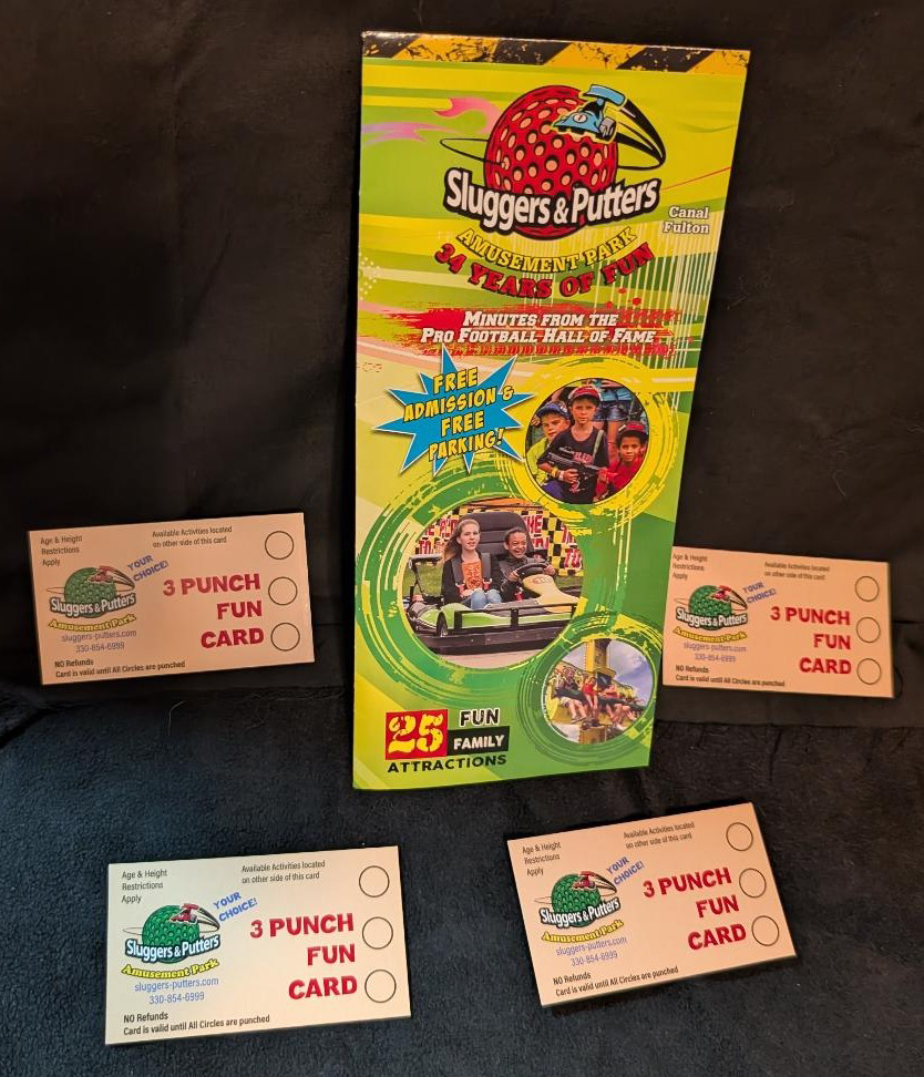 FUN FUN FUN, includes (4) 3 punch fun card, you can pick 3 activities per card. Choose from this list: F-22 Raptor Go Karts Jr. Racer Go Karts Water Bumper Boats Adventure Mini Golf Olde Skool Mini Golf Dodge'Em Bumper Cars The Flying Chair Swings The Scrambler Lil' Dipper Roller Coaster Rock Climbing Outdoor Laser Tag 4 Batting Cage Tokens (32 pitches) Tea Cups There is a concession stand for your enjoyment and many more activities. Plan on an all day adventure!