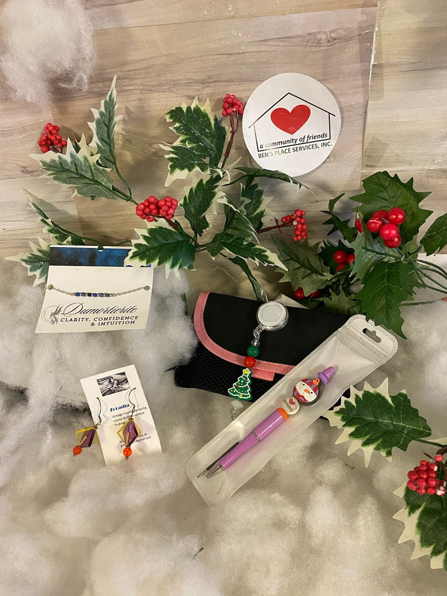This small travel pouch is big enough to carry your jewelry or other small necessities for that short stay somewhere. Includes in this gift is handmade Christmas pen, a handmade Christmas retractable badge holder, a beautiful bracelet, all designed by Ben's Place, and a pair of earrings.