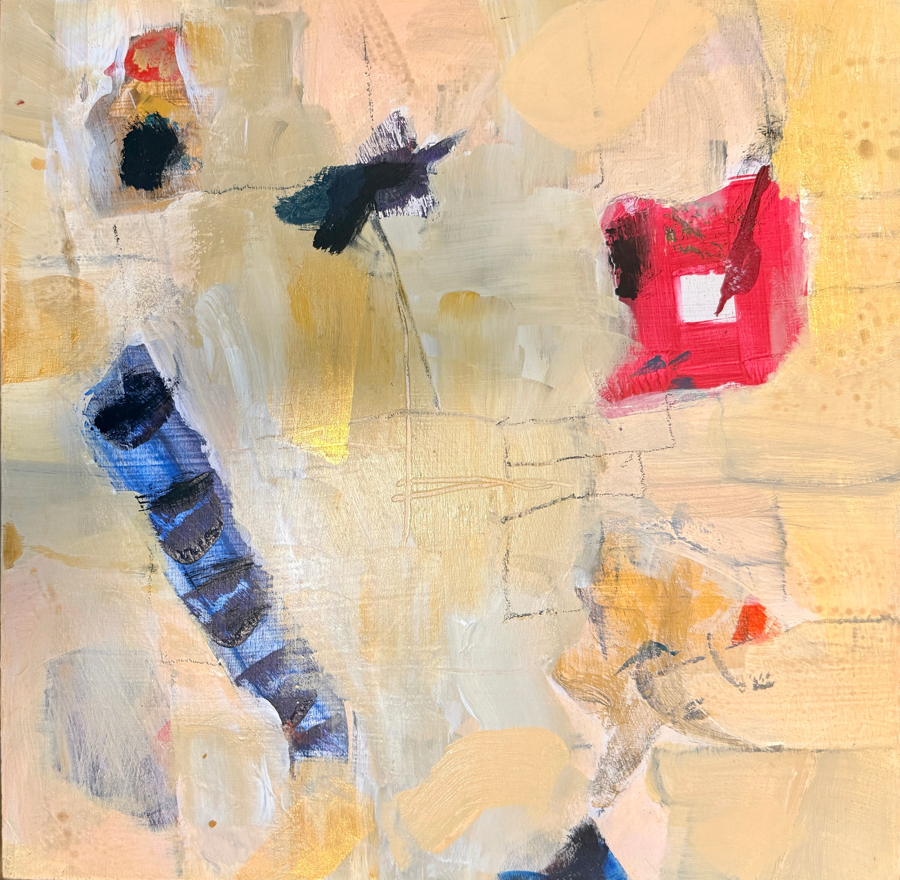Soft washes of cream and pale gold create an expansive ground where isolated marks—bands of blue, a red square, dark gestural strokes—hover like signals trying to be noticed. This painting explores how meaning can emerge from restraint, allowing space itself to carry as much weight as form. The scattered elements suggest moments of decision, interruption, or recognition, inviting viewers to slow down and discover how their own attention completes the composition.