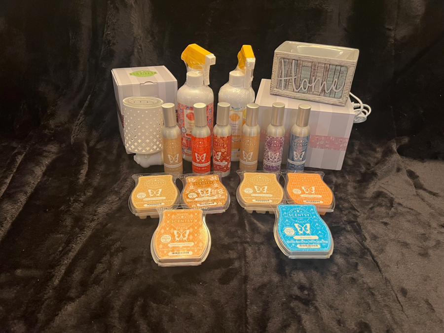 Scentsy Gift Basket Includes: (1) Home Warmer, (1) Plug In Mini Warmer, (2) Counter Cleans, (6) Room Sprays, (6) Wax Bars