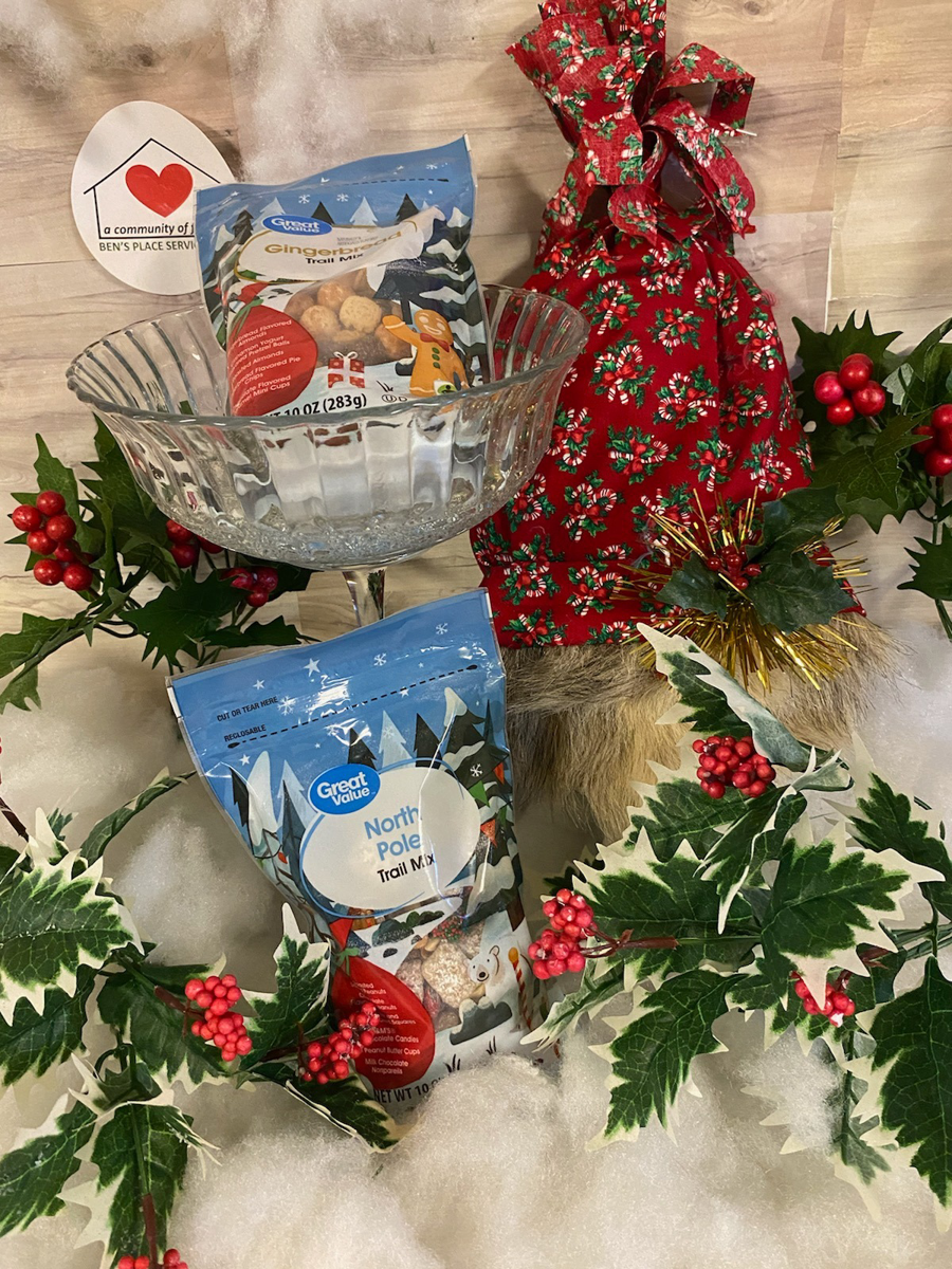 Fill this created bowl with delicious snacks for your holiday get together or just decorating your tree. Comes with 2 bags of trail mix, 1- Gingerbread flavor and 1- North Pole flavor. Don't forget to hang you handmade Christmas gnome decoration made a Ben's Place.