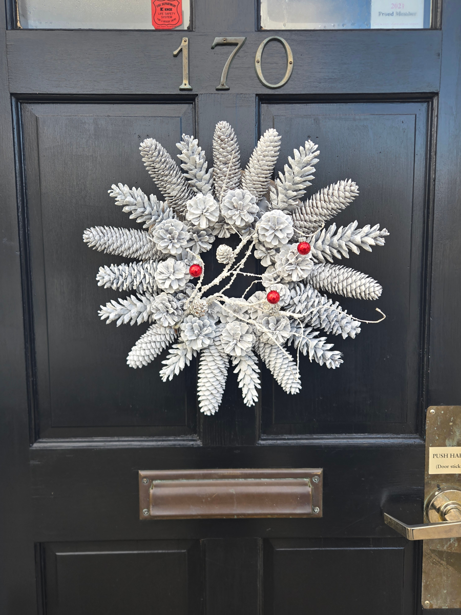Turn your home into a winter wonderland with this wreath made of painted pinecone. Indoor use only. Donated by Maeve Rice