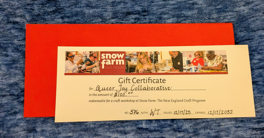 Auction Item: Snow Farm $100 Gift Certificate Donated by: Snow Farm, Williamsburg, MA Snow Farm: The New England Craft Program is a nonprofit residential craft school in Williamsburg, MA, located in the foothills of the Berkshire Mountains. The surrounding area of the Pioneer Valley is rich with artists, master crafters, pottery tours, open studios, the beauty of the New England landscape in all seasons, and the five-college communities of Northampton and Amherst.
