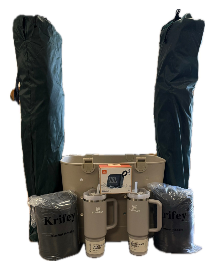 Tote, 2 - Bag Chairs, 2 - 30 oz Stanley Tumbler, 2 Hoodie Blanket, Bluetooth Speaker