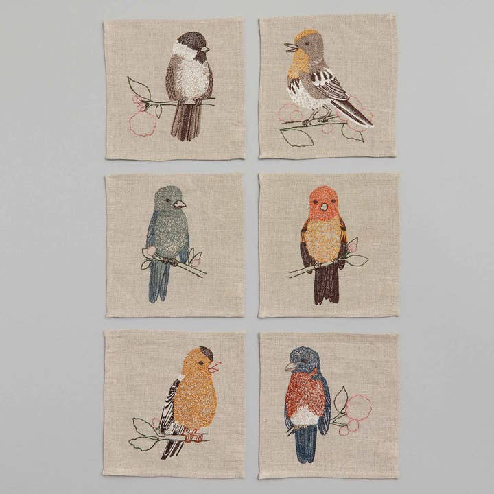 From Coral & Tusk, six linen cocktail napkins with a different embroidered songbird on a cherry blossom branch. Includes Eastern Bluebird, Black Capped Chickadee, Mountain Bluebird, Western Tanager, American Goldfinch, and Yellow-rumped Warbler. Napkins are 5.5 x 5.5 inches