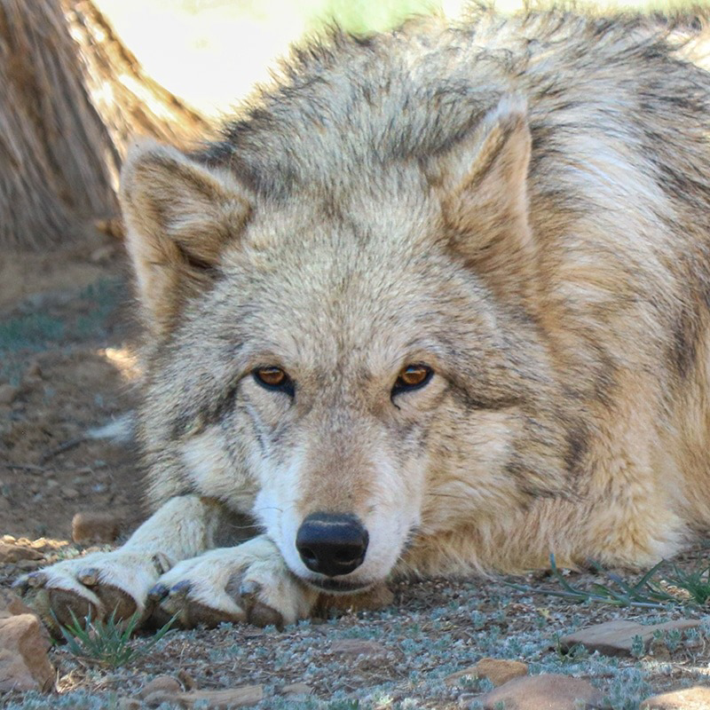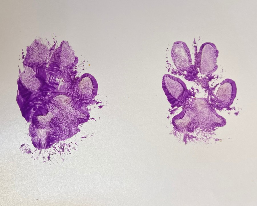 Paw prints from resident high-content wolfdog Sox on thick paper. Sox was given to the Wild Spirit after her breeder noticed unusual and concerning behaviors he believed to be neurologic. After her arrival at Wild Spirit, she was put on anti-anxiety meds and as she settled into her new home these strange behaviors started to wane. She even started to warm up to some of our Caretakers! Fun Fact: Sox is a very picky lady when it comes to companionship. Throughout her time here, we have tried to pair her with numerous male wolfdogs, all of whom she lived well with for short periods because they grew uninterested. This was until her breeder got in contact with us to see if we would be willing to take in her younger brother Gambit. The two have been living together happily ever since!
