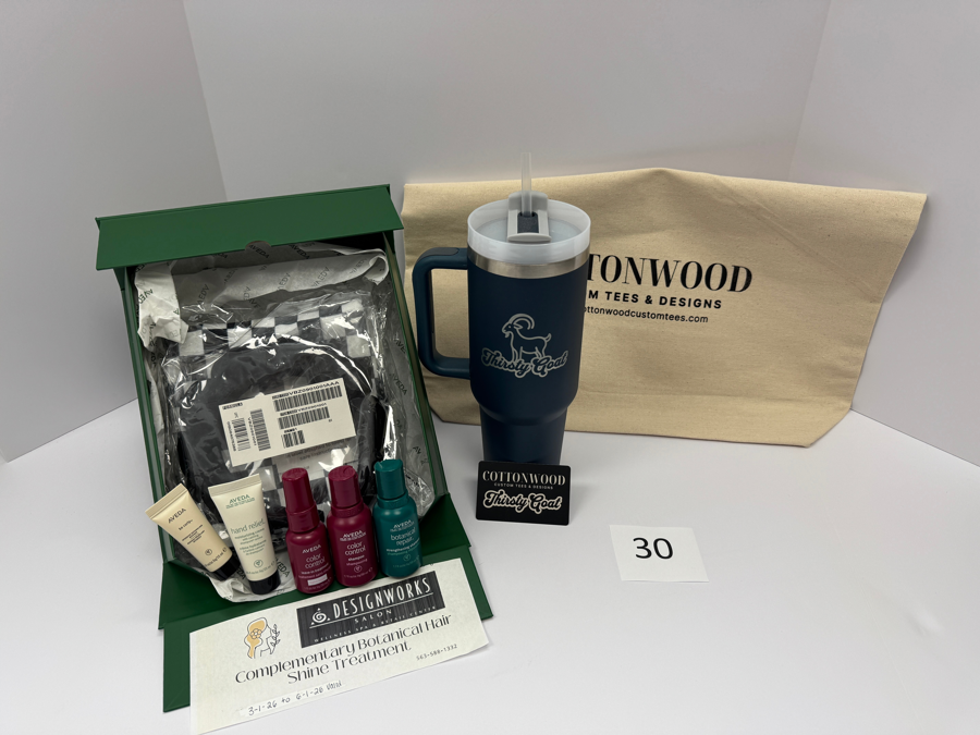Headband and Towel, complementary botanical hair shine treatment, intensive detangling masque, hand relief, shampoo, strengthening shampoo, and leave in treatment, $25 gift card to Cottonwood or Thirsty Goat, Tumbler and Canvas tote bag