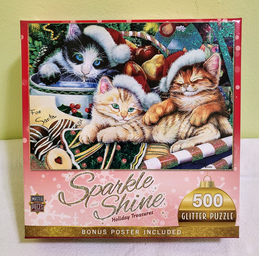 These kittens are getting sleepy waiting for Santa! Have fun assembling this 500 piece glittery puzzle based on a painting done by Tucson native Jenny Newland. Very gently used.