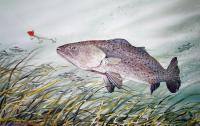 Feel the thrill of the strike with “Speckle Fever” by Thelma Peterson. This dynamic coastal scene captures a speckled trout gliding through shallow marsh waters, eye fixed on a bright lure just above. The movement of the grasses, the shimmer of light across the water, and the lifelike detail of the fish bring energy and anticipation to the moment.