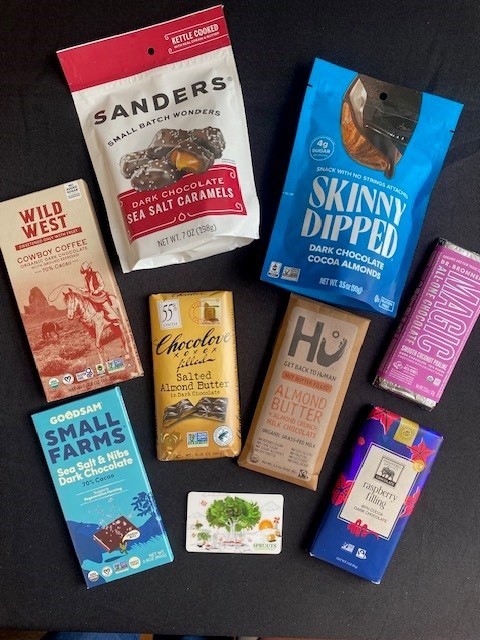 This tempting basket includes a $50 Gift card to Sprouts Farmers Market, plus EIGHT high-quality chocolate items, including bars, caramels, and nuts, all packed in a cute little woven basket. Bid high and bid often...this one won't last long!!