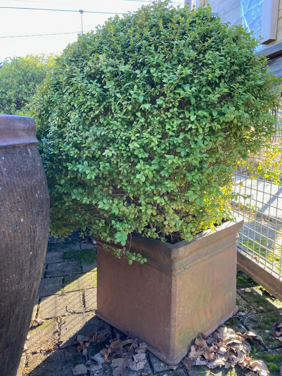 Unglazed stoneware surface, with raised rim edging, planted with mature healthy boxwood shrubs pruned in round shapes.