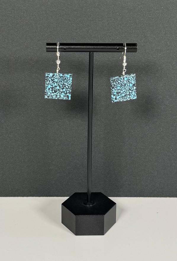 A modern take on the classic turquoise slab earrings - square stabilized turquoise. 1 1/2 by 3/4 inches Artist: Jameson Pete, Santo Domingo Pueblo