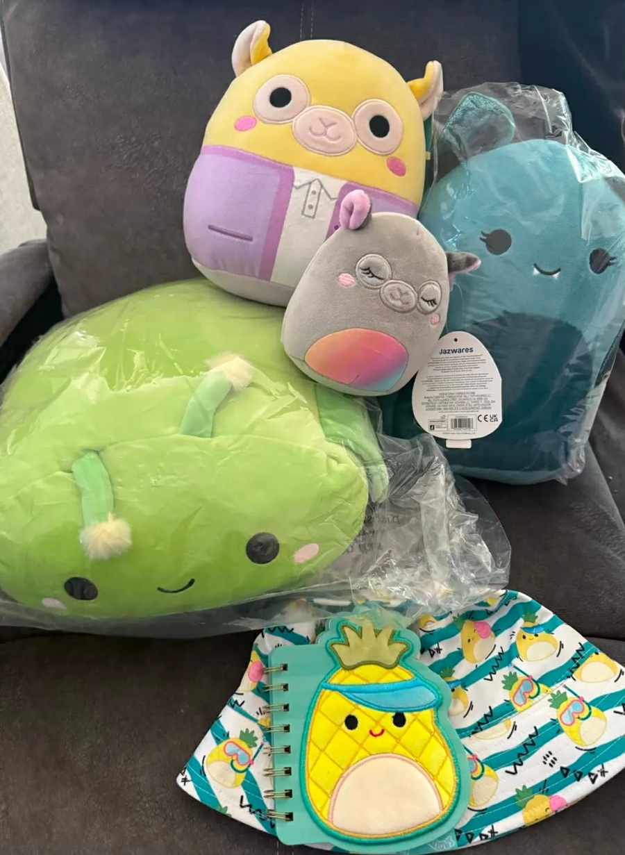 A collection of Squishmallows big and small, including a Maui the Pineapple mini spiral notebook with matching bucket hat.
