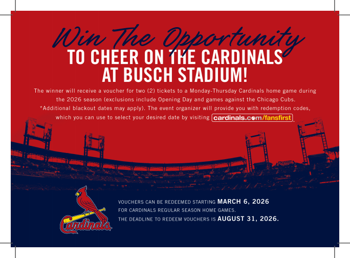 The winner will receive a voucher for two (2) tickets to a Monday-Thursday Cardinals home game during the 2026 home season (exclusions apply including Opening Day, Labor Day and games against the Chicago Cubs).