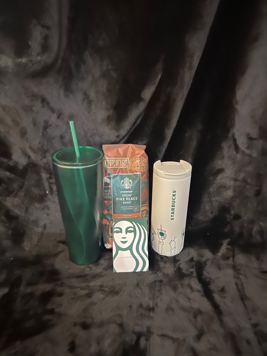 Starbucks gift basket: Includes $100 Starbucks gift card, (2) Starbucks cups, and one bag of Starbucks coffee.