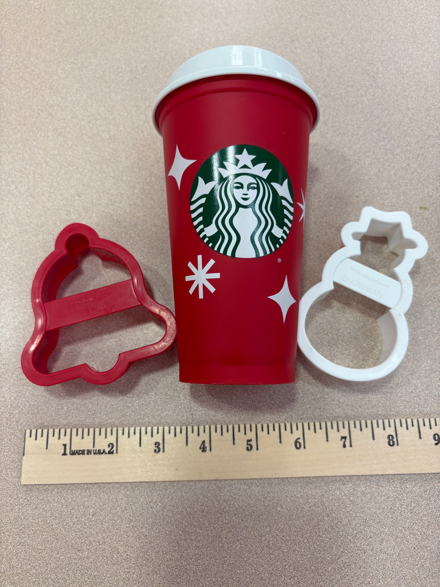 Starbucks Holiday Reusable 16 oz Cup + Fox Run Snowman & Bell Cookie Cutters