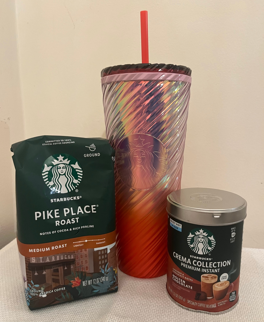 This collection features a stunning ombre venti Starbucks cold cup (24 oz), one 12 oz bag of Starbucks Pike Place coffee (ground), and a 7 oz can of Starbucks Crema Collection Molten Chocolate. It's sure to bring someone a smile and thoughts of sunshine this winter!