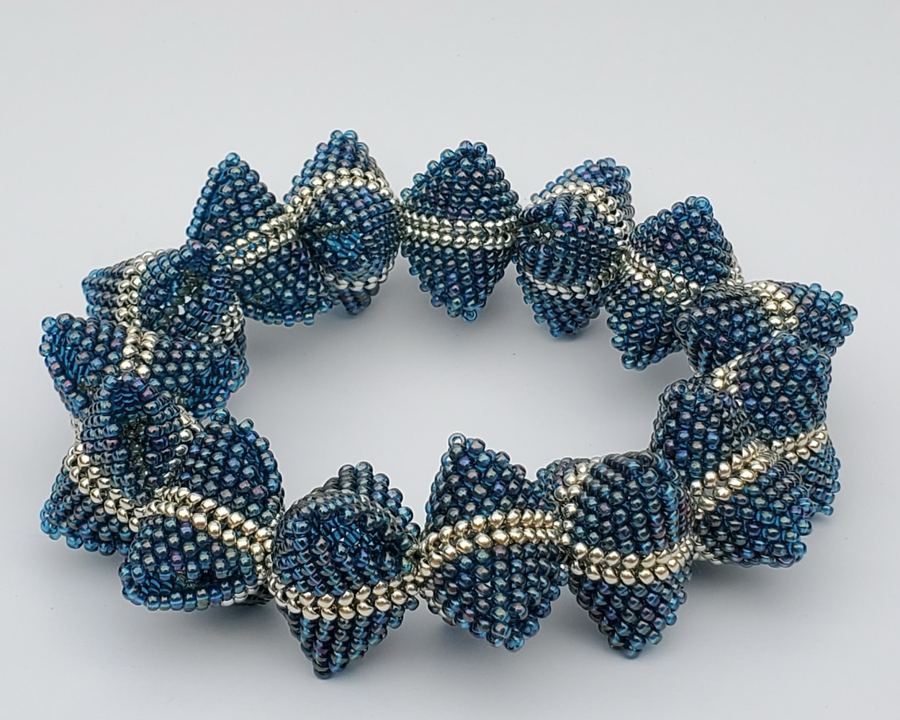 As the name suggests, the Starts and Ends with Three Bangle design is a continuous rope of folded flat triangles. It’s a chunky design but still comfortable to wear all day. There is a 60-degree orientation change as each triangle in the rope is stitched which I typically accentuate by adding patterns on only one face as it spirals around the rope. The Starts and Ends with Three Bangle also have a series of special Enhanced versions with added horns, wings, or a combination of added horns and wings.