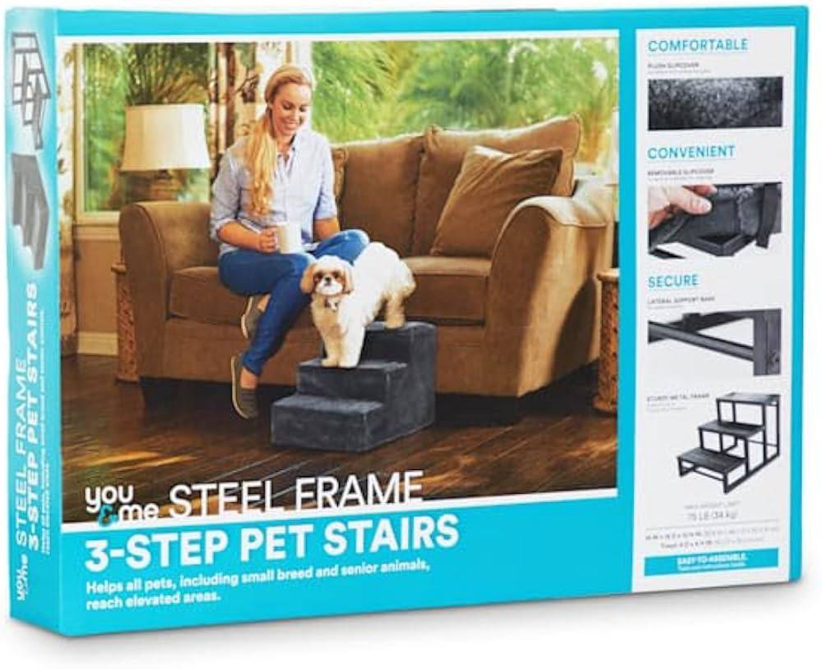 Brand: You & Me Material: Metal Color: Gray Target Species: Dog Maximum Weight Recommendation: 90 lbs Dimensions: 14" W x 12" H x 18" D Assembly Required: No Features: Comfortable plush slipcover provides a soft surface for paws Removable and machine washable slipcover for easy cleaning Secure lateral support bars add stability Sturdy metal frame supports up to 90 pounds Value: $85 Thank you to Jerome for this great donation. Perfect for helping pets access higher places safely and comfortably!