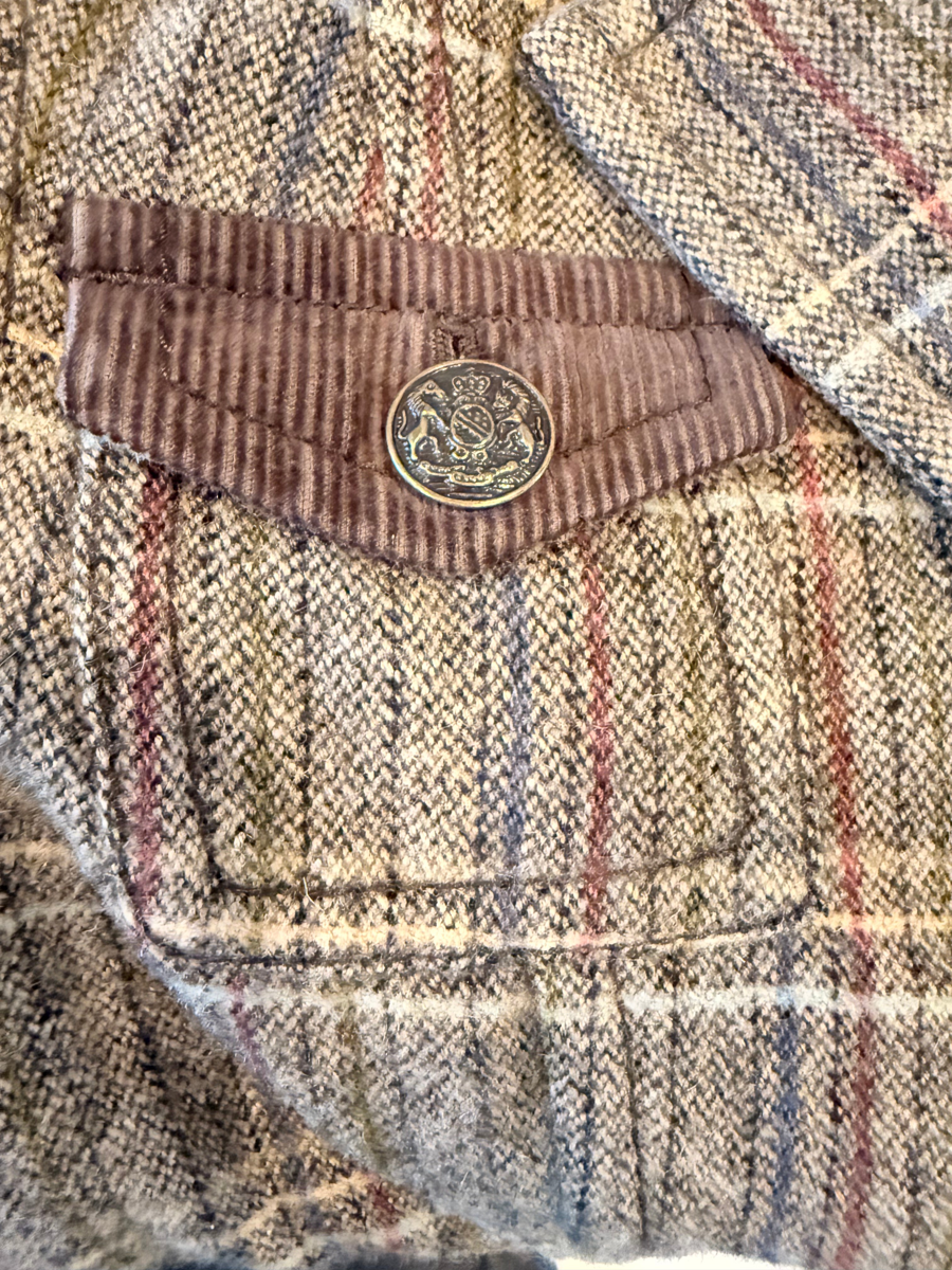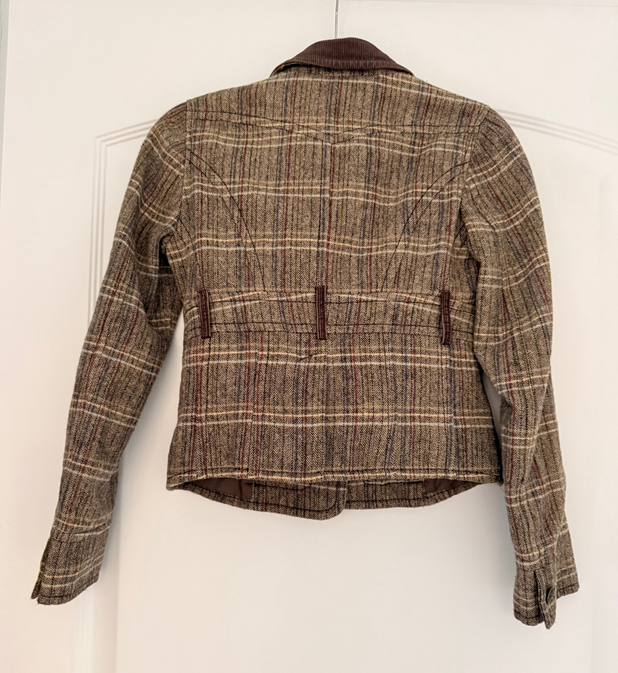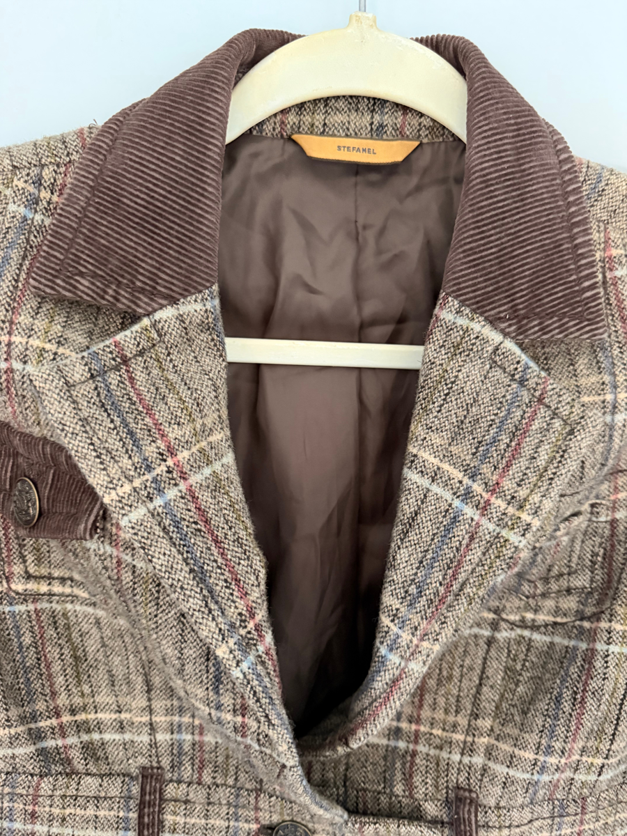 This is a Stefanel brown plaid wool blend blazer jacket with corduroy detailing. The buttons have an exquisite design stamped on them. It features corduroy belt loops and a back vent for level of comfort and movement. This jacket fits like a size 0. Color: Brown Condition: Gently used Size: xs , fits like a size 0, pit to pit 16in, waist 29 in, top arm to hem 18.5 in Material: 55% wool, 24% viscose, and 21% polyester