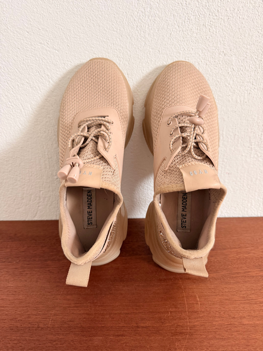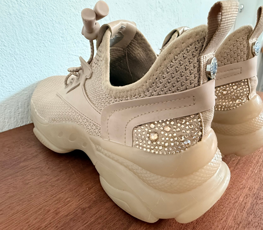 This is a Steve Madden platform sneaker. Rhinestone embellishments and ribbon taping design. They are made with an engineered mesh for structure, stretch and enhanced breathability. The foam padding placed around your ankle collar & under the tongue offer for an incredibly comfortable fit & feel. Perfect for walking the parade route visiting your friends along the way.