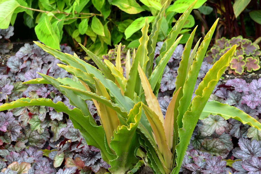 Eucomis ‘Glow Sticks’ is a dwarf pineapple lily with coppery gold new foliage aging to a light green gold. White pineapple-like flower heads. Very easy to grow and tolerates a wide range of garden conditions. Full sun for best foliage color. Grow in containers or the ground.