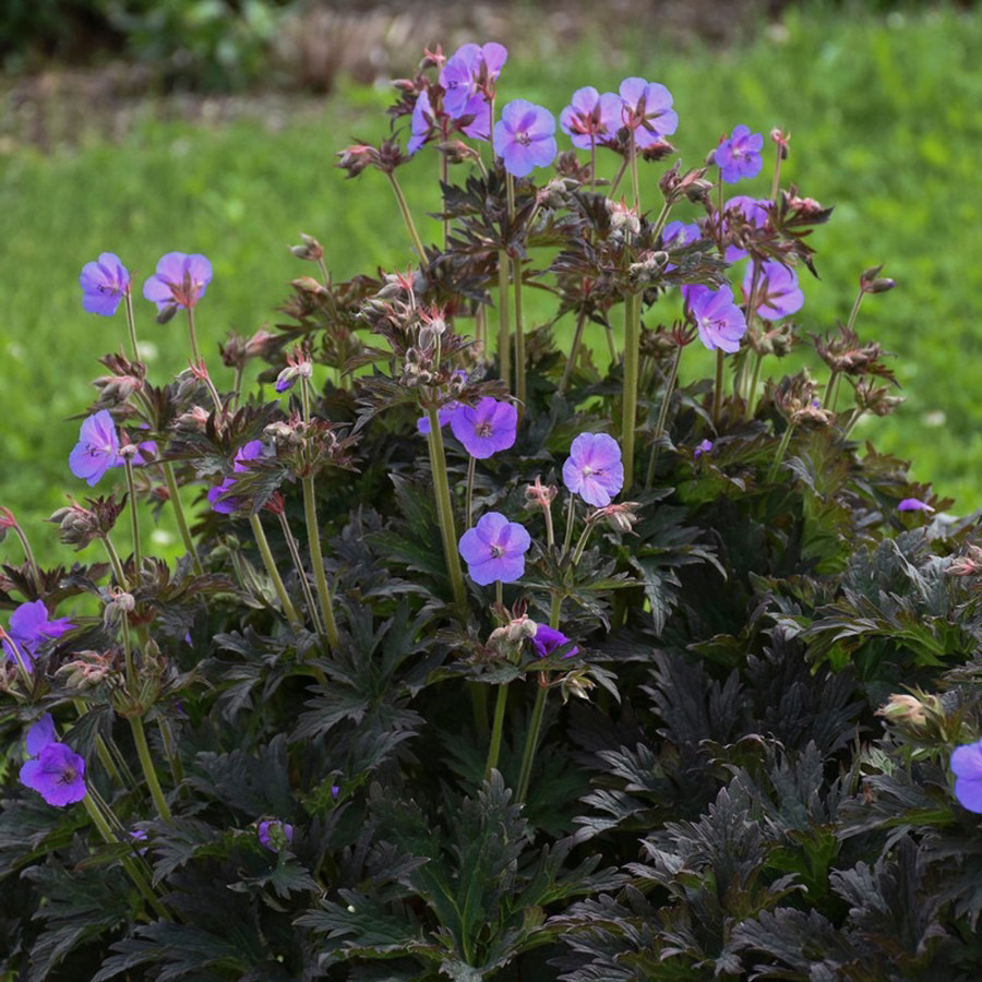 Geranium 'Boom Chocolata' has a chocolatey look with rich, dark bronze leaves and an upright habit and blue-purple flowers in early summer and is vigorous with a very refined habit. Geranium maculation 'Huggy Bear' sports bronze-chocolate-reddish leaves, soft pink flowers, and increased tolerance to direct sun and foliar diseases. Geranium phaeum 'Samobor' maple leaf-shaped cut foliage highlighted by a large purple-black circle in the center. In May topped with numerous 2' spikes of strongly-reflexed, dark lavender flowers.