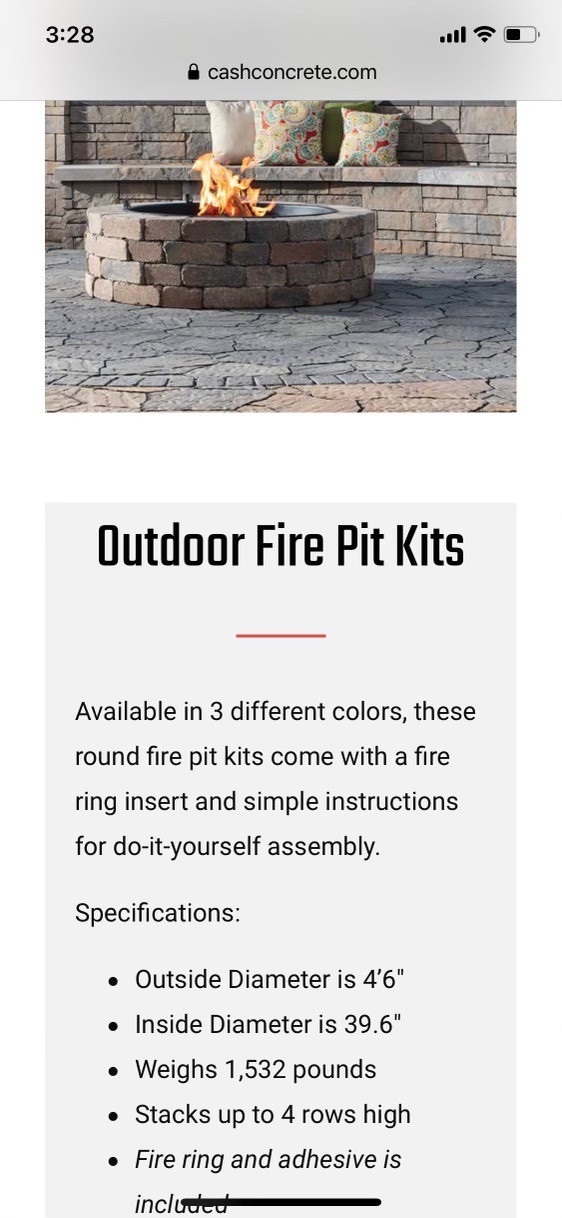 Looking for a way to spruce up your backyard? Snag this fabulous firepit and invite some friends over for a cozy night under the stars! Available in 3 different colors, this kit comes with a fire ring insert and simple instructions for DIY assembly. Outside diameter 4'6", Inside diameter 39.6", Weighs 1,532 lbs, Stacks up to 4 rows.
