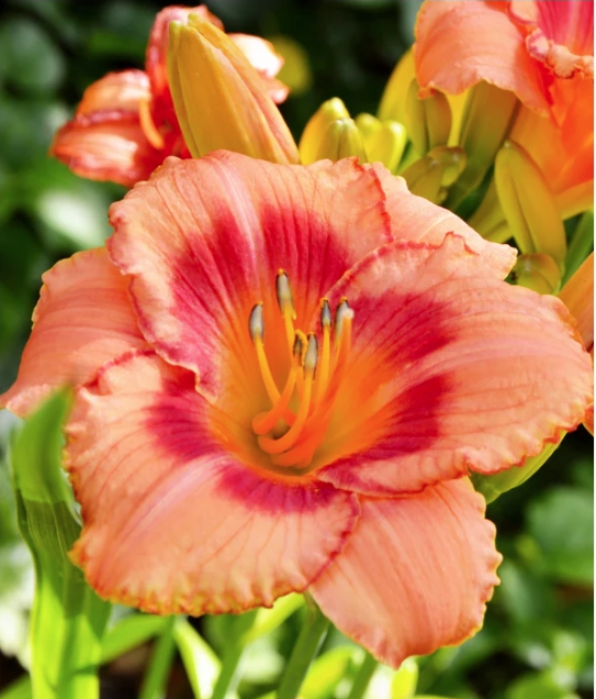 A 1998 Stout Silver Medal winner! This ravishing daylily opens huge 4-1/2" blooms of apricot pink, trimmed in red and with yellow throats that flush to a strawberry red. Petals are nicely recurved and tightly ruffled along the edges. Height 22-26". Rebloomer.
