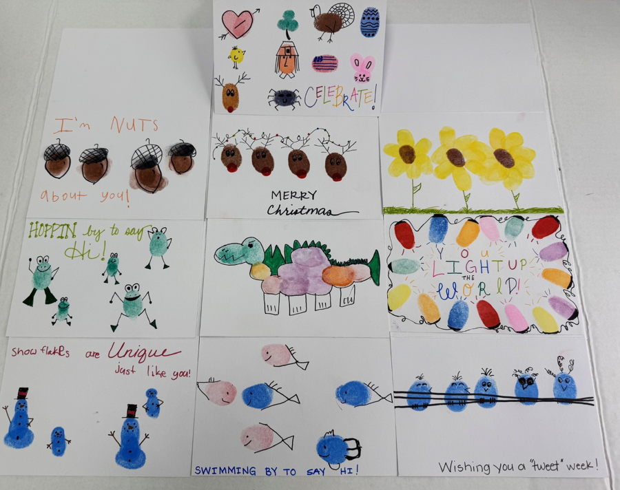 This auction includes a (10) piece Variety Greeting Card Set with envelopes. These cards were created by 5th grade students using Thumbprint Ink Art.