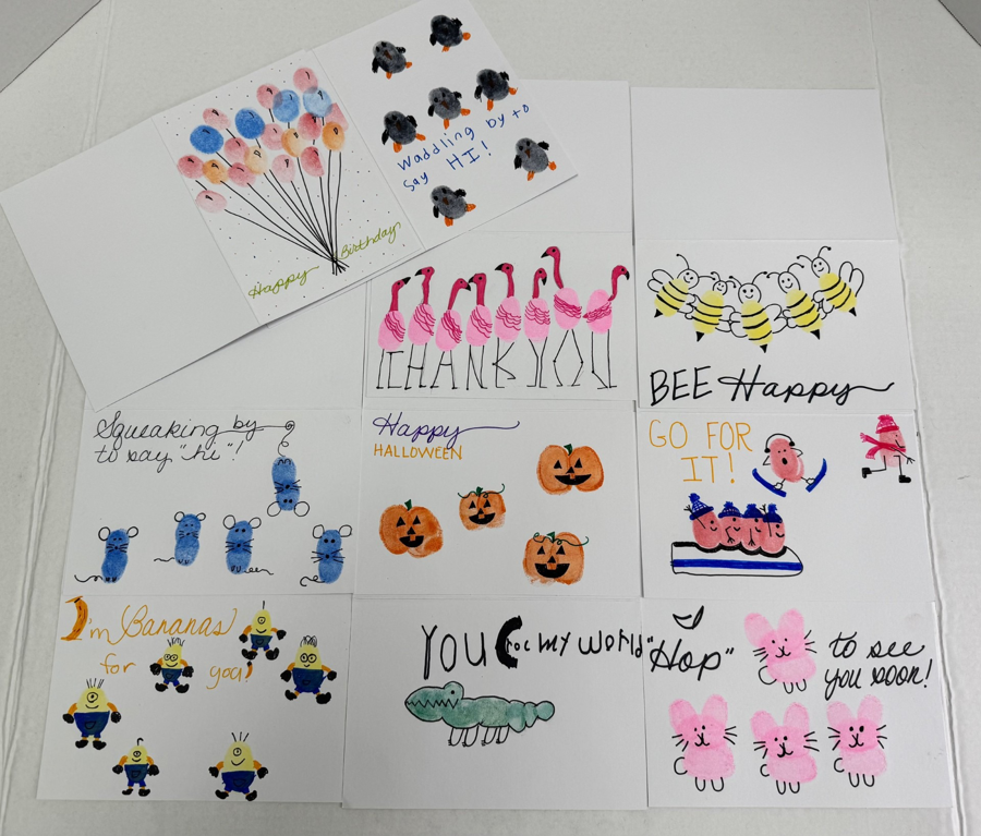 This auction includes a (10) piece Variety Greeting Card Set with envelopes. These cards were created by 5th grade students using Thumbprint Ink Art.
